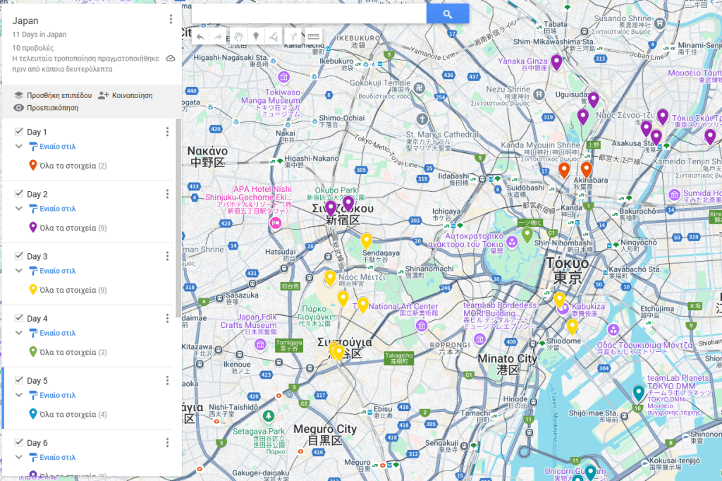 Αν η οργάνωση είναι κι εσένα το χόμπι σου, μπορείς να χρησιμοποιήσεις το Google My Maps. Είναι ένα δωρεάν εργαλείο που σου επιτρέπει να φτιάξεις τον δικό σου custom χάρτη, με ξεχωριστά επίπεδα (layers) για κάθε μέρα ή κατηγορία.